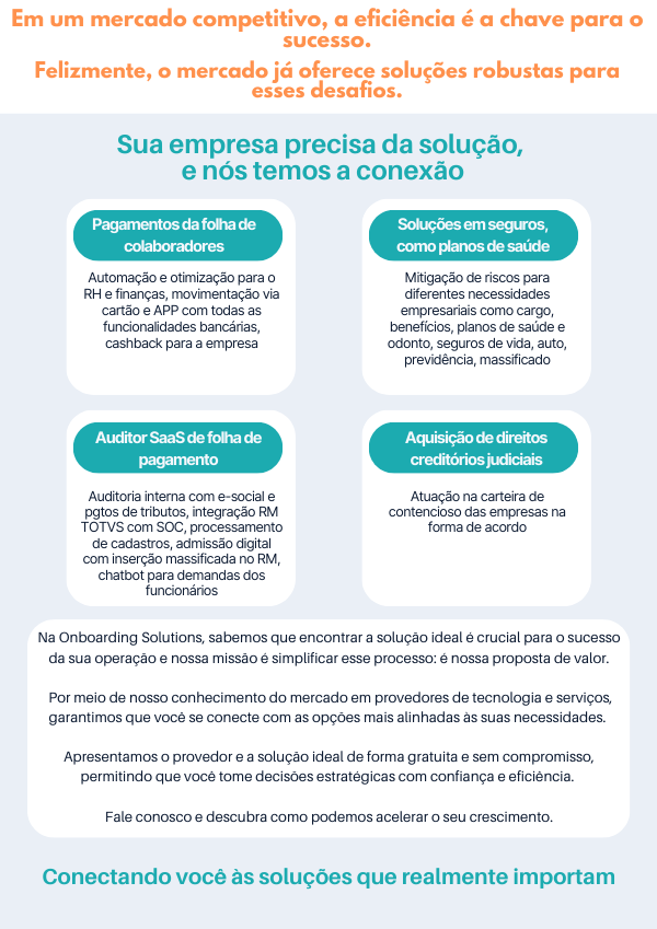 A Onboarding Solutions é uma empresa especializada na intermediação e agenciamento de serviços, promoção de vendas e de consultoria em gestão empresarial, com foco particular em serviços financeiros.